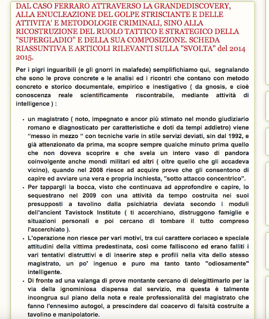 [ Hanno tentato di far sparire tutto e tutte le prove e dispensato dal servizio Paolo Ferraro per "inettitudine" con perizia integralmente falsificata, e dopo un sequestro di persona ... poi tentando di eliminarlo con la morte civile in ogni maniera, ed ora che è tutto pubblico e tutto é emerso occorre che la magistratura sana intervenga. [* VEDI ARTICOLO PRECEDENTE