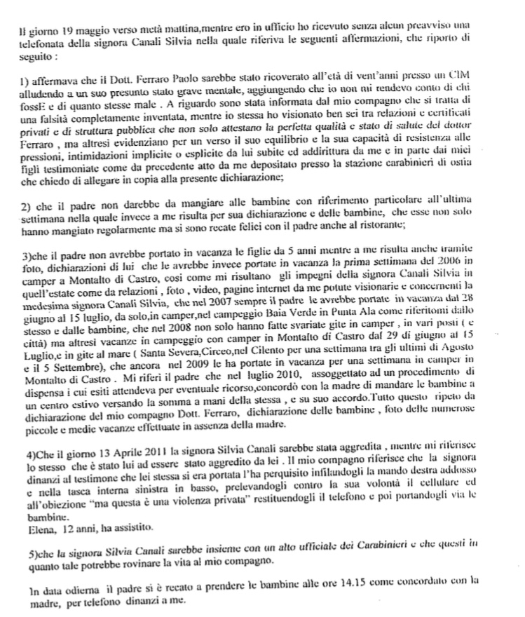 Solo un mese prima Silvia Canali aveva fatto più di una telefonata a mia moglie dott.ssa Patrizia Foiani, disturbandola in ufficio ed in presenza di testimone collega di lavoro, esilarata, raccontandole oltre a quanto sopra indicato, numerose cose tutte letteralmente inventate gravissime e altamente indicative e, tra esse, che “Paolo Ferraro a 20 anni era stato ricoverato e/o trattato da Centro di Igiene Mentale”. La dichiarazione esposto di Patrizia Stefania Eugenia Foiani, da lungo tempo in suo possesso e dell'ufficio, sulla assurda e gravissima circostanza e molte altre, era stata FORMALMENTE depositata e ricevuta dall'ufficio di pg della Stazione CC di Ostia la medesima mattina del 25 aprile 2011, prima di recarci presso casa VALLINI CANALI. [ALL. A e in formato zip “ ESPOSTI DENUNCE E MISSIVE DI PATRIZIA FOIANI]