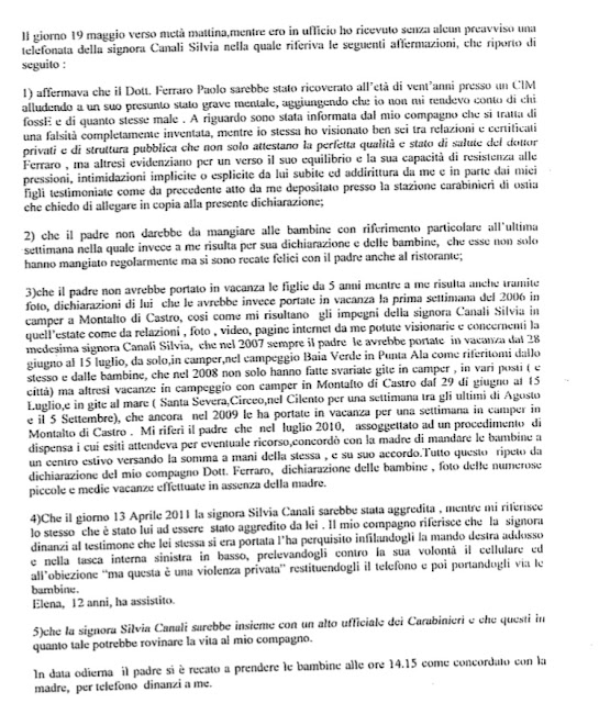 Pochi minuti dopo Silvia Canali da me incalzata dichiarò, nell'ambito del medesimo incontro a più persone registrato il giorno di Pasquetta 2011, 25 aprle 2011, confermando ma con riferimento a carteggi email sue, quanto già era da let stato ammannito in precedenti telefonate, e cioè che era in possesso di certificazioni ad oggetto "Paolo Ferraro" che le sarebbero state date ad opera di psichiatri "amici suoi" di università con riferimento all'Università da lei frequentata. Quale fuoco concentrato e distruttivo fosse in corso e respinto al mittente è notorio e tutto è pubblicato.