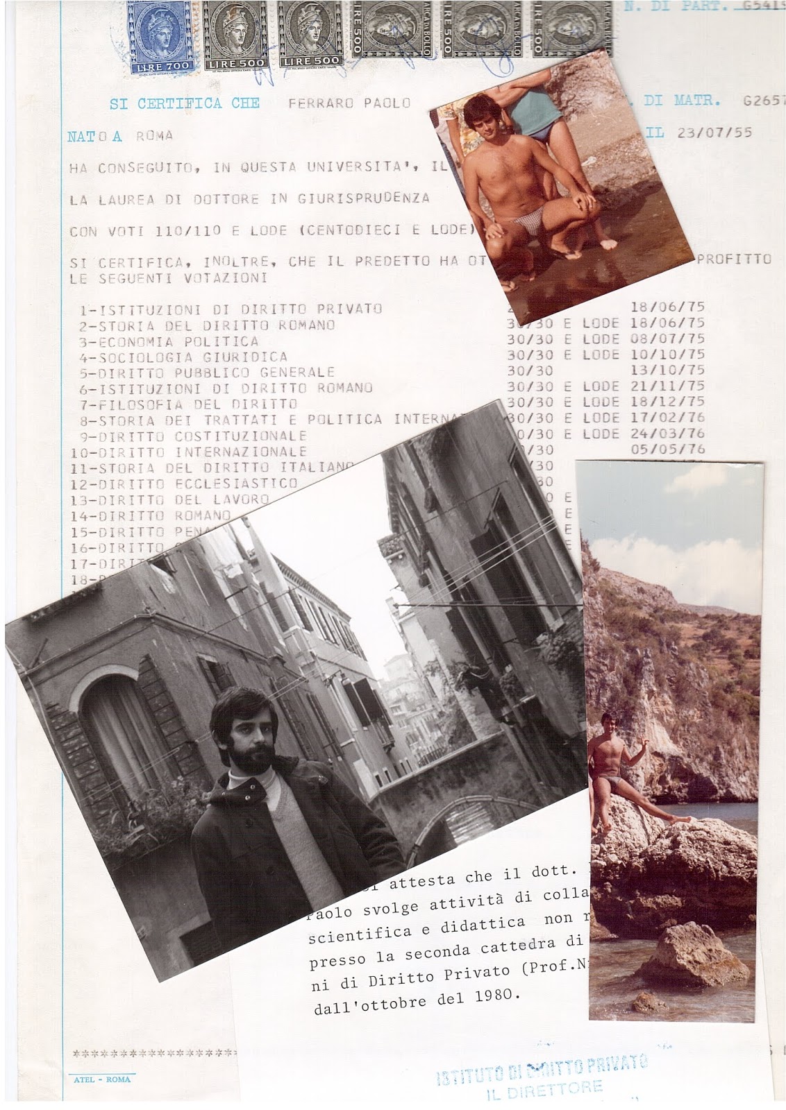 ° ALL. B la certificazione universitaria (io iscritto dal primo novembre 1974) di miei dieci esami tenuti presso la Università degli studi di Roma tra il giugno 1975 ed il maggio 1976 con la media del 30 e lode, ed alcune foto dell'incapace di intendere e volere in vacanza.