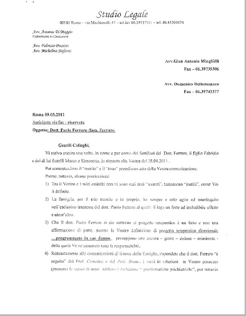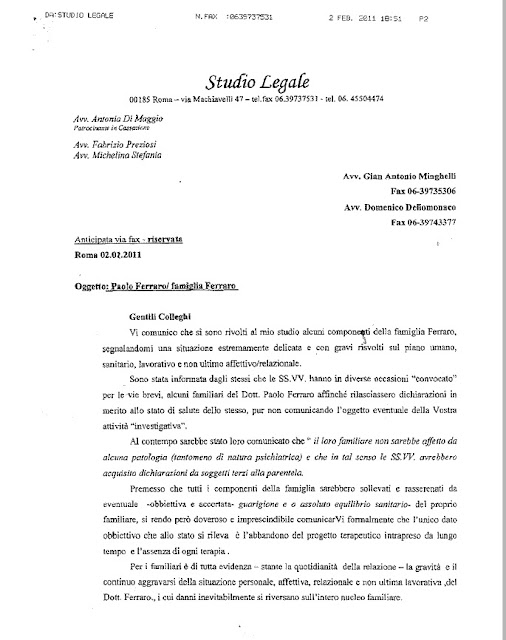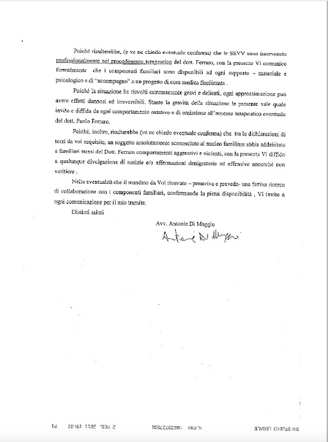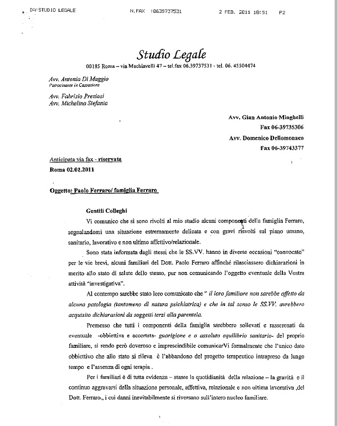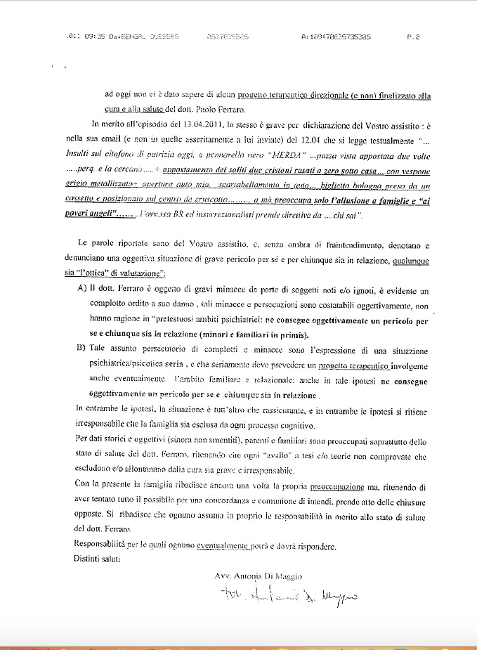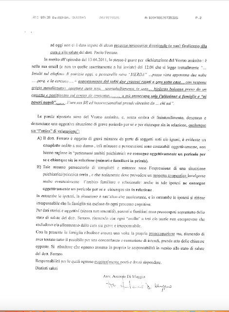 Antonia Di Maggio già difensore di anarco insurrezionalisti, era la stessa che in nome e per conto di Simonetta Ferraro, con cui aveva rapporti diretti, e Marco Ferraro, aveva "inviato" fax e lettere a dir poco minatorie nella primavera del 2011 (dopo la denuncia del 7 marzo 2011 e MEMORIALE depositati presso autorità giudiziaria), duramente replicate e risposte dagli avvocati Minghelli e Dello Monaco, poi anche Cecchetti Mauro. Tutto già immesso ed illustrato altrove ma qui reimmesso nelle "missive minatorie" principali prima e repliche principali poi, affinchè ognuno si renda conto della portata della criminale iniziativa e minaccia permanente subita dal dott. Paolo Ferraro.