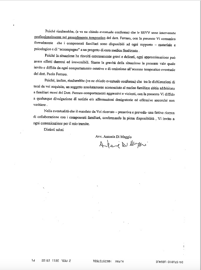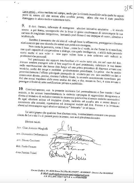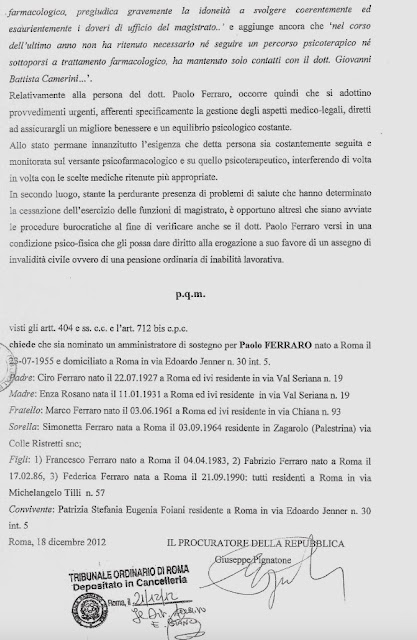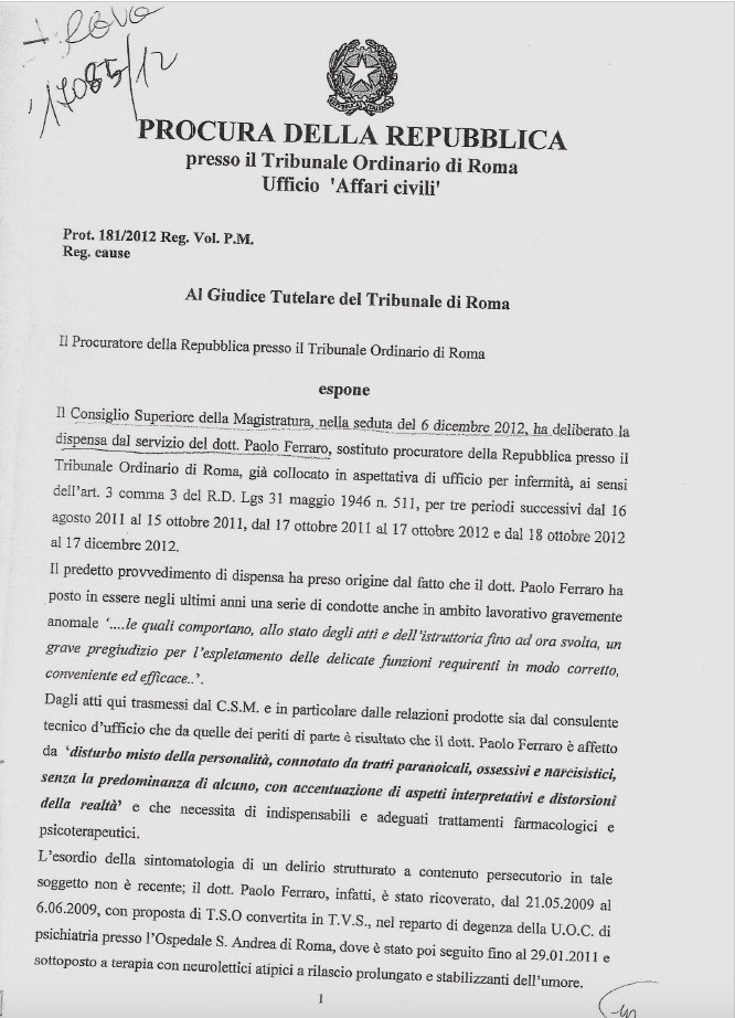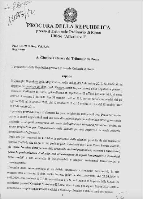 L'avvio del tentativo di distruzione del magistrato Paolo Ferraro da parte della Procura deviata di Roma in accordo con SILVIA CANALI, e con gli "alcuni parenti Ferraro" mediante istanza di sottoposizione ad "amministrazione di sostegno".