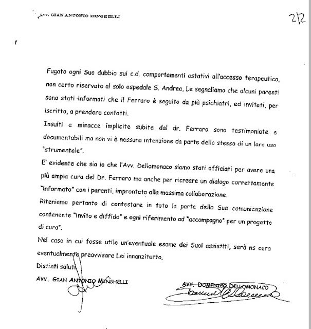 A Marco Ferraro e Simonetta Ferraro vanno riferite le gravissime fandonie inventate ed immesse in una ANAMNESI priva di ogni rapporto con la realtà, poi rinvenute vergate confusamente a mano e non sottoscritte neanche dall'ignoto estensore nella cartella dell'ospedale Sant'Andrea. (si leggano a riguardo le pagine dedicate alla esatta ricostruzione dell'episodio nell'ATTO al Consiglio di STATO più sotto citato con link ).