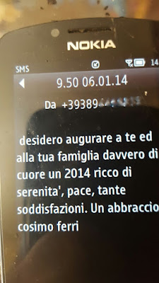 Il sei gennaio del 2014, inviato dal Sottosegretario "permanente" al Ministero della Giustizia, magistrato fuori ruolo COSIMO FERRI (attuale sottosegretario nonostante il cambio dei Ministri sino ad oggi), perviene al dott. Paolo Ferraro l'sms che segue.