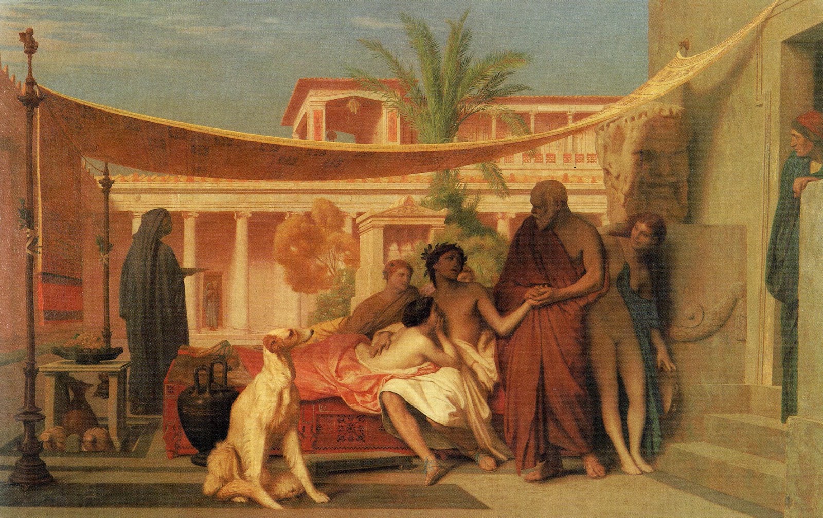 A Socrate, più sano e vegeto che mai, l'ennesima coppa, tempestata di gemme , orlata di miele e contenente l'ultimo veleno insidioso, incolore ed insapore