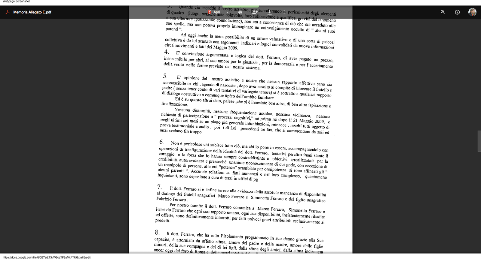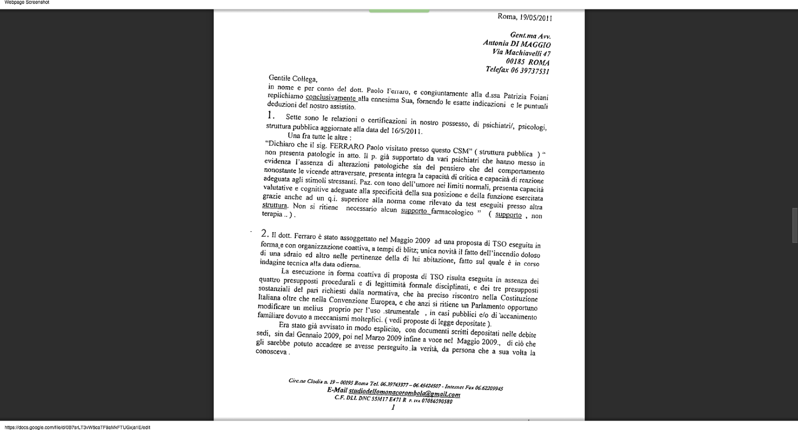 3) Nota indirizzata in data 18.01.2011 dagli Avv.ti Dellomonaco e Minghelli al Prof. Paolo Girardi della struttura del Reparto psichiatrico Ospedale S. Andrea: in essa gli avvocati indicano che il Prof. Giovanni B. Camerini, dopo attenta visita e controllo del Dott. Ferraro Paolo ha escluso “ogni possibile profilo psicotico o elementi produttivi deliranti”; ma ha altresì affermato che “i convincimenti del Dott. Ferraro erano fondati su basi concrete e plausibili “certificando che non esistono disturbi psichici preesistenti, mentre lo stato di ansia lieve riscontrato da fattori (oggettivi) esterni” (il Dott. Ferraro era appena scampato al tentativo di azzittirlo ed impedire la sua azione di denuncia mediante nuova aggressione organizzata, in ordine alla quale vi è ampia prova diretta anche da registrazioni tra presenti depositande in altra sede)