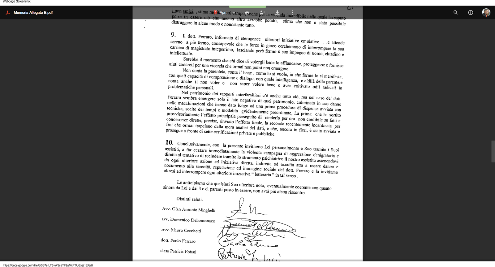 1) Denuncia esposto alla Procura Generale presso la Corte di Appello di Roma inviata in data 20/1/2011 a firma dot. Ferraro Paolo, Avv. Minghelli e Avv. Dello Monaco, con la quale si fa emergere per la prima volta in un documento pubblico e scritto la gravità delle vicende e la macchinazione ordita in danno del Dott. Ferraro