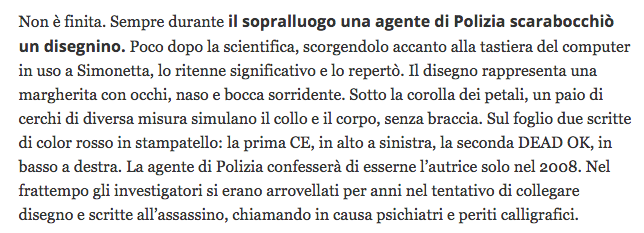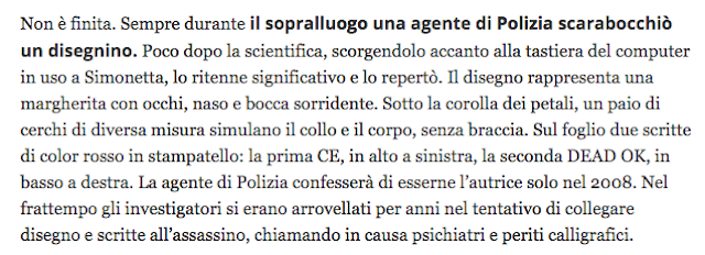 Si ricordava lui, come mi ricordai io, di un disegno di un pupazzo margherita, lui sapeva bene che era stato lasciato o trovato sul luogo dell'omicidio di Simonetta Cesaroni, e mi ricordai o mi disse lui di un qualcosa di simile lasciato e fatto trovare dopo il furto al caveaux della banca di Roma svariati anni dopo, all'interno del palazzo di giustizia (palazzina B) di piazzale Clodio. Un chiaro segnale, con coinvolgimento di criminalità non di basso livello: a Roma: come si alza il livello si arriva ad eversione nera, di solito. E ai servizi, deviati quasi sempre. Quel disegnino di pupazzo margherita mi ritornò alla mente come non solo visto su un quotidiano, ma facente parte di quel pomeriggio accaldatissimo, nella stanza del collega super informatico ... La chiacchierata estiva del 2013 ha colorato di una nuova ulteriore luce le mie riflessioni. Poi grazie alla stra-informata avvocatessa molto "organizzata" ho rimediato dal suo archivietto personale una interessante pubblicazione che propongo a tutti ... ma soprattutto agli investigatori e pubblici ministeri seri e professionali .... “.