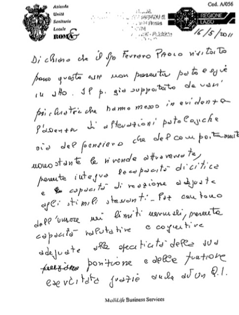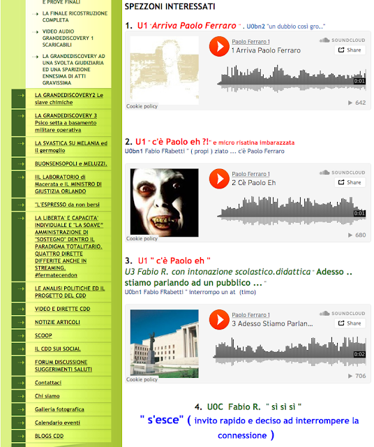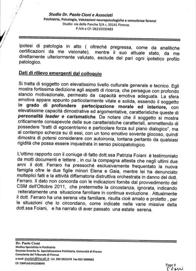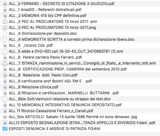 Fatti conosciuti il 10 dicembre 2018 dal sottoscritto dott. Paolo Ferraro. In data Lunedì 10 dicembre 2018 mia moglie Patrizia Foiani nata a Roma il 21 febbraio 1966, coniuge da anni e compagna sin dal 2010, e testimone diretta ed esponente di buona parte di quanto accaduto sino ad oggi, ancora colpita dall'incredibile svolgimento ed evoluzione ed andamento, purtroppo divenuto infine spiegabile agevolmente, della udienza penale relativa al processo in intestazione, avendo scoperto quanto segue a seguito di una ricerca da lei effettuata di sua esclusiva iniziativa, mentre ero intento a lavorare al mio pc in altra stanza lontana dalla sua, mi ha trasmesso alle ore 00:47 il link https://www.areadg.it/referenti (ALL.to A screenshot tratto da programma whatsapp.). [N.B. Tutti gli allegati integranti e costituenti parte essenziale ad ogni effetto del presente atto di ricusazione vengono depositati insieme ed all'interno del dvd di prove dirette in apposita directory aggiunta "ALLEGATI ATTO DI RICUSAZIONE". IL DVD è invece attivabile cliccando sul file indexgenerale.html] Tutto i file ivi compreso IL DVD-ISO indicati sono scaricabili e consultabili dal link ipertestuale che segue: "ALLEGATI ATTO DI RICUSAZIONE"] IL giudice Maria Laura Paesano, ho quindi appreso direttamente ieri all'ora indicata (ed estraneo io alle recenti vicende interne alla magistratura non potevo in alcun modo sapere) è REFERENTE DISTRETTUALE per la componente (storicamente egemonica e vincente all'interno) di MD e per AREA (ALL 1). Come ero anche io magistrato iscritto però ad una “altra” MD “ideale” i cui valori costituzionali e legali condivido/condividevo realmente, attivo nel mio ruolo di giurista e magistrato ispirato alla e circoscritto dalla Costituzione. E debbo rammentare che fu Paolo Ferraro nel 1996 con il paginone articolo su un quotidiano a tiratura nazionale (ALL 1 bis) a lanciare un allarme ed un abbozzo di analisi ed indicazioni ben incomplete allora, poi approfondite e concretizzatesi con prove dirette uniche al mondo su vicende di quadro ben più che provate ed allarmanti. Che la intera area enucleata in AREA sia “contro-interessata” (eufemismo) e in atteggiamento di patente inimicizia è peraltro fatto oltreché notorio, semplicemente logico. Sicché di temerario sotto questo aspetto c'è solo l'incessante perseverare nonostante EVIDENZE DIRETTE E MULTIMEDIALI fatte pervenire ed ormai in possesso di buona parte della magistratura sana, da me difesa e riconosciuta pubblicamente, nonostante e contro tutto e tutti coloro che intendano strumentalizzare senza discernimento. Nel corso della fase preliminare del dibattimento era stata su mia richiesta e dalla difesa, allor non inerte e comunque non ostacolante, depositata documentazione relativa al diretto interessamento per conoscenza della detta giudice, quando rivestiva presso il Ministero di Giustizia incarico dirigenziale, circa il complesso delle vicende, di chiaro rilievo globale ed istituzionale. L'invito ad astenersi era stato respinto mediante ordinanza in atti (in buona sostanza “il giudice non aveva avuto come dirigente ministeriale l'incarico di approfondire la vicenda”). Non ero e non sono però a conoscenza di quale Ministro avesse operato la chiamata diretta del giudice al Ministero, vista la rapidità del suo arrivo allora al Ministero. Orbene il banale procedimento e processo per diffamazione e altro reato assolutamente inesistente e ad ogni buon fine scriminata secondo pedisseque osservazioni e sotto svariati profili (ALL 2 Memoria ex art 415 bis CPP e relativi supporti digitali di prova, a sua volta smarrita in fase procedimentale e recuperata come da PEC ALL 3 diretta al Procuratore di Roma ove era stata separatamente depositata -cautela rivelatasi necessaria e preveggente - più allegato ALL 4 breve sintesi con deposito di DVD di prove, e memorietta di supporto) si è repentinamente bloccato, in-esaminato imputato e in-ascoltati testi tutti a difesa più documentazioni tutte da acquisire, con un rinvio a nuova udienza per conferimento di incarico peritale incredibile dictu sulla mia “incapacità di intendere e volere”. Dopo otto anni soprattutto di documentazioni e certificazioni incompatibili anche di provenienza di organismo pubblico (ALL 8 vari) , ma soprattutto pubblica attività intellettuale mia seguita da centinaia di migliaia di persone e pervenuta nella sua obiettiva consistenza di dati e prove oggettive a svariate migliaia di interlocutori istituzionali. Ma persino la dispensa per “fantomatica” inettitudine comminata nel 2012 non solo non parlava certo di capacità e di intendere o volere, ma si riferiva a “perizia” che testualmente “recitava”, nell'esatto contenuto del termine, che i dati “non soddisfano i criteri per alcun disturbo della personalità” ( basta leggere la pur truccata, da informazioni tutte integralmente false, ed ideologicamente falsa consulenza di allora, integralmente contestata anche mediante la “intervenuta” registrazione audio a monte dello strappo di TEST sfavorevoli, da parte dello stesso perito nel giugno 2011. Prove video audio in atti in DVD depositato e ALL 8 bis Relazione del dott. Vannucci sullo strappo dei TEST. Ma si veda la dettagliata autopsia della “perizia” frammento per frammento, introdotta con ricorso dinanzi al Consiglio di Stato )(ALL 5). Non è però questa la sede per tuonare sulla ultima ennesima iniziativa, anche perchè è tutto di una evidenza lapalissiana, estesa ai quanti interlocutori istituzionali suindicati. La prova sta in realtà in ciò che ebbe a scoprire e dimostrare chi scrive, fino al giorno prima riconosciuto come magistrato di altissime doti senza alcun possibile rilievo (ALL 6) , ed è oggi pubblica ed insormontabile. (Neanche più aggirabile perché in mano a tutta la magistratura). E si verte in tema di attività militari segrete ed attività coperte gravi, della cui esistenza e consistenza vi è ormai prova irrefutab