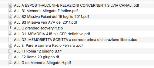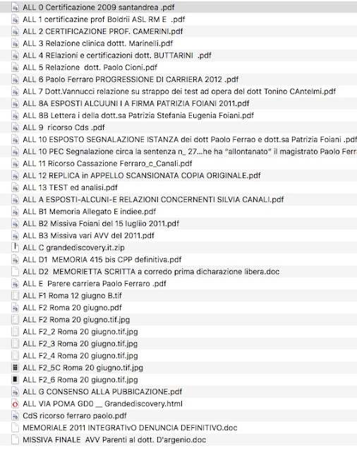 Le allego a tal proposito, per non tediarLa un indice riferito ad un solo blocco di atti e solo qualche esemplare della documentazione a dir poco chiarissima di provenienza di un piccolo stuolo di professionisti e dalla dott.ssaPatrizia Stefania Eugenia Foianii anche da LEI pretermessa INTEGRALMENTE - e sottolineo la gravità del fatto confrontato con la eventuale acquisizione di artate documentazioni/dichiarazioni di parte terza- (ALLti B) a tutela del magistrato Paolo Ferraro, aggredito quando emersero pubblicamente prove sui veri fatti che concernono la grandediscovery 1 2 e 3.