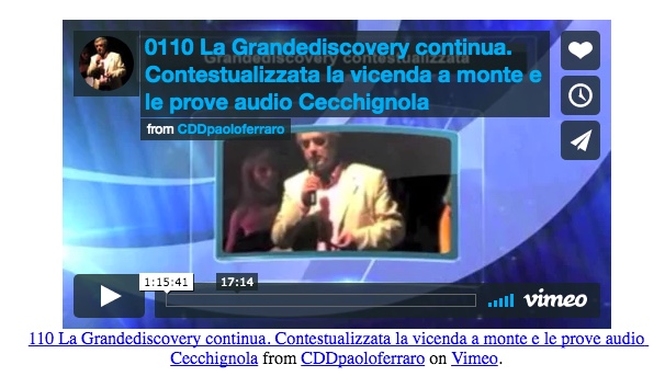 QUESTO ULTIMO AGGIORNAMENTO, " AUDIO VIDEO DISCOVERY CECCHIGNOLA VICENDA A MONTE. LA PSICO SETTA MILITARE A NUDO, GLI INTRECCI SUB-ISTITUZIONALI E LA GRANDEDISCOVERY." CONCERNE VERSIONE PREGEVOLE INTEGRALMENTE REVISIONATA ED INTEGRA COME PROVE IL RECENTE "Perseverando diabolicamente si sono venuti perdendo". Ora istituzioni e professioni sono integralmente informate. Per consultare, ascoltare, valutare prove dirette leggendo più comodamente da sito on line di massima leggibilità, con video in embedding, basta fare click qui o sul titolo più sotto, dopo la immagine