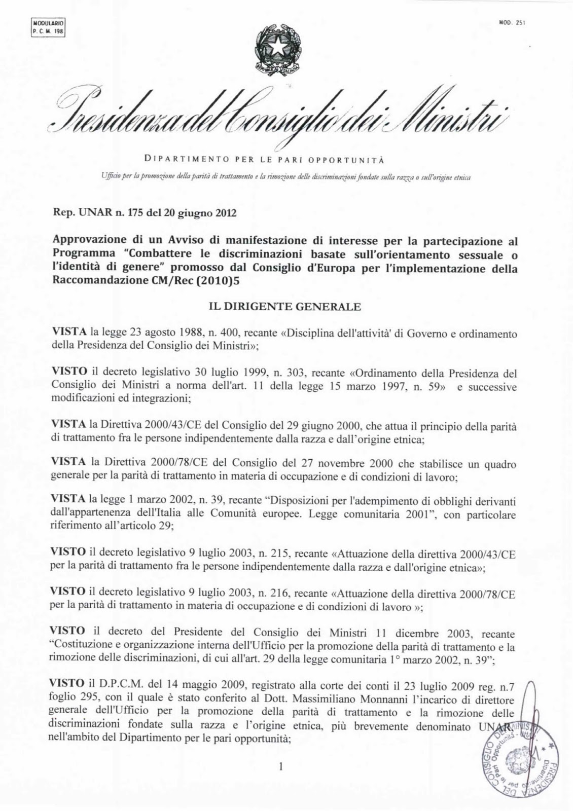 Detto e fatto. L’Italia ha aderito prima di tutti. Infatti, l’Ufficio Nazionale Antidiscriminazioni Razziali (UNAR), istituito all’interno del Dipartimento per le Pari Opportunità, ha pubblicato le linee guida di una Strategia Nazionale LGBT per l’applicazione dei princìpi contenuti nella suddetta Raccomandazione. Protagonista indiscussa dell’operazione, il ministro del Lavoro con deleghe per le Pari opportunità Elsa Fornero che ha disposto due Direttive (2012 e 2013).
