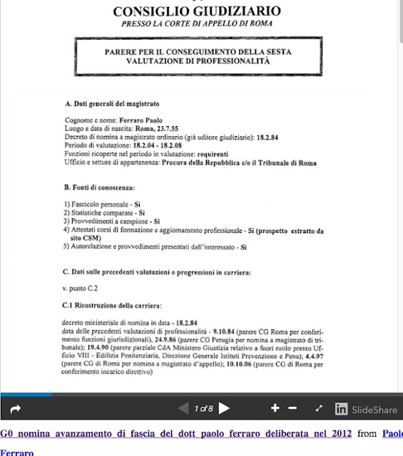 E si compulsi la promozione di fascia del magistrato di Cassazione dott. Paolo Ferraro deliberata dinanzi ad un ulteriore parere eccezionale nell'autunno 2012 (!!) a prova della bipolarizzazione architettata nella ormai nota consiliatura che ha “operato” e infine “deliberato”, per le ragioni che ormai emergono a caratteri cubitali. (ALL “G0 Nomina avanzamento di fascia del dott Paolo Ferraro deliberata nel 2012” )