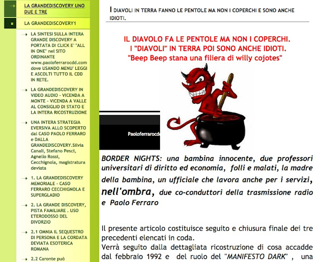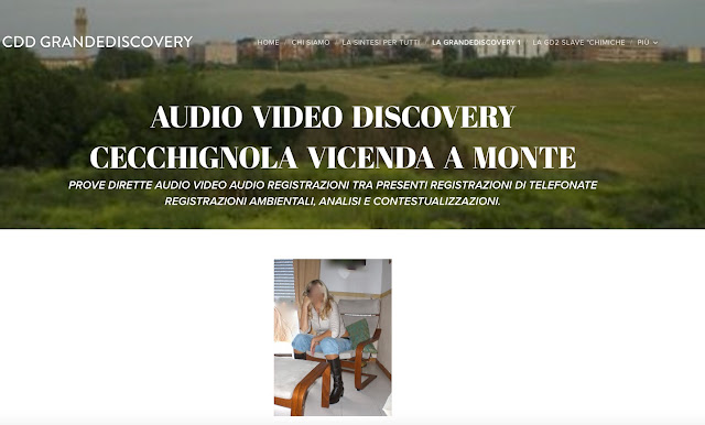 SI VEDA ALL “G5 prima pagina” e l'indirizzo in DVD apribile da indice nella directory grandediìsovery1 “ www.grandediscovery.it/brogliacci-e-video-audio-sulla-psico-setta-a-basamento-militare-e-coperture-eccellenti-della-cecchignola-con-integrale-contestualizzazione/index.html “ che contiene tutto il sistema di prove multimediali direttamente vagliabili ed i brogliacci delle registrazioni ambientali nella Cecchignola più altro.