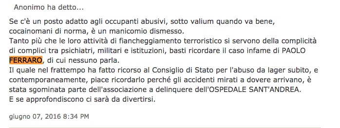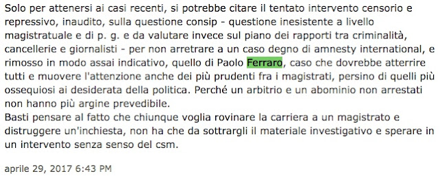 Ciò solo dimostra, per tornare al tema, il logico intento del dott. Paolo Ferraro di tornare a svolgere la attività professionale ed istituzionale nell'interesse della indipendenza della magistratura e ovviamente nell'interesse “personale”, che è poi la questione della sua collocazione lavorativa e del mantenimento suo e della sua famiglia e delle figlie anche, oltrechè la questione della tutela di un (ex per ora) magistrato e della citata indipendenza reale della magistratura, che non è fatta di chi trama. E citiamo solo ora le frasi colte ed illuminanti casualmente rinvenute oggetto dell'allegato “H2 INDICAZIONI ANONIMO PROFESSIONALMENTE INFORMATO” : “ ..per non arretrare ad un caso degno di amnesty international .. quello di Paolo Ferraro, caso che dovrebbe atterrire tutti e muovere l'attenzione anche dei più prudenti tra i magistrati, persino di quelli più ossequiosi ai desiderata della politica. Perchè un arbitrio ed abominio non arrestati non hanno più argine prevedibile. ”. Paolo Ferraro .. ” il quale nel frattempo ha fatto ricorso al Consiglio di Stato per l'abuso da lager subito e , contemporaneamente, piace ricordarlo, perchè gli accidenti mirati a dovere arrivano, è stata sgominata parte della associazione a delinquere dell'OSPEDALE Sant'Andrea. E se approfondiscono ci sarà da divertirsi” . Qualcuno che ama la legge e la giustizia si muove nel nostro paese e all'insaputa di Paolo Ferraro.