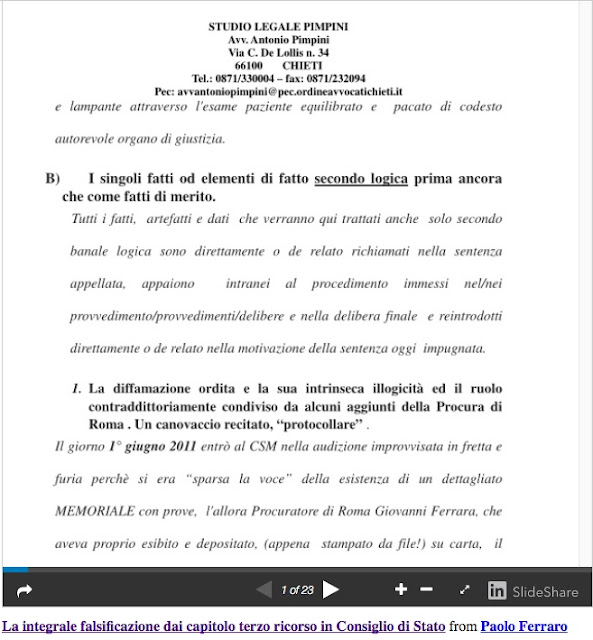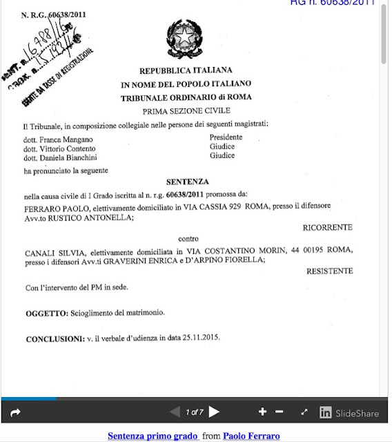 Si precisa che questo materiale serve ormai solo ed esclusivamente a comprovare la “metodologia” della controparte, di negazione manipolata delle stesse evidenze, usata per l'ennesima scriteriata volta in questa sede processuale. IL FATTO PROVATO, PACIFICO E AMMESSO E DICHIARATO DALLA CANALI stessa viene prospettato come una “invenzione patologica” (sic!!), con modalità che non meritano di sprecare appellativi già evocati dal medesimo spudorato argomentare di controparte e dal silenzio dei “convitati di pietra”. Ma la posta in gioco è piuttosto nascondere quanto si presta ad una oggettiva e necessaria interpretazione sistematica del tutto e che solo come tale fu vagliato dal dott. Paolo Ferraro sin dal 2006. Dopo la “scoperta” e condotte della Canali violente, il dott. Paolo Ferraro consapevole (del ben altro e ben più articolato che si intravedeva, visto che si verte di un noto magistrato di Cassazione attenzionato da tempo non solo per doti e capacità “invise” e che aveva altresì appena portato a termine le indagini inerenti il procedimento OIL FOR DRUG) dopo chiarimenti con la Canali che portarono ad una totale ammissione ed a una sua in realtà succube pervicacia nel destabilizzare il rapporto col padre delle sue bambine, semplicemente si sottrasse al vincolo con la stessa Canali, separandosi e “falliva” così la destabilizzazione che avrebbe dovuto incastrare il dott. Paolo Ferraro. Ma, sottrattosi, non si poteva più perseguire la pista abbozzata e fallita: questa è' stata ripresa con maggiore accanimento persecutorio ed organizzato mediante la donna della Cecchignola ed anche in quel caso con grandi intuito investigativo il dott. Paolo Ferraro é stato capace di capire e poi provare (IL MEMORIALE del 7 marzo 2011 depositato ad autorità giudiziarie di Perugia e Teramo nel 2011 DETTAGLIA TUTTO. ALL “00 MEMORIALE del 7 marzo 2011 “in digitale ed in cartaceo, e già depositato”), poi subendo sequestro di persona (ALL “00 IL SEQUESTRO DI PERSONA dal MEMORIALE del 7 marzo 2011”) costretto a subire senza titolo giuridico e di fatto contro la sua serena e libera volontà e tutto il resto, una volta che aveva ricostruito ed analizzato PROVE dirette. PROVE ormai pubblicamente illustrate a livelli tali da costituire FATTO NOTORIO tale da non poter più essere neanche sottoposto a tecniche di maldicenza ed esclusione pettegola che fanno parte di metodiche pseudo protocollari definitivamente delegittimate e svelate.