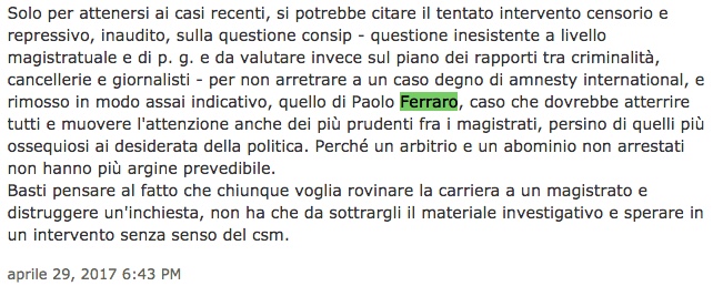 Chi sia e di quale notorietà ancora goda e e di quale stima il magistrato (ex per ora) dott. Paolo Ferraro, nonostante quello che ha subito, è FATTO NOTORIO.